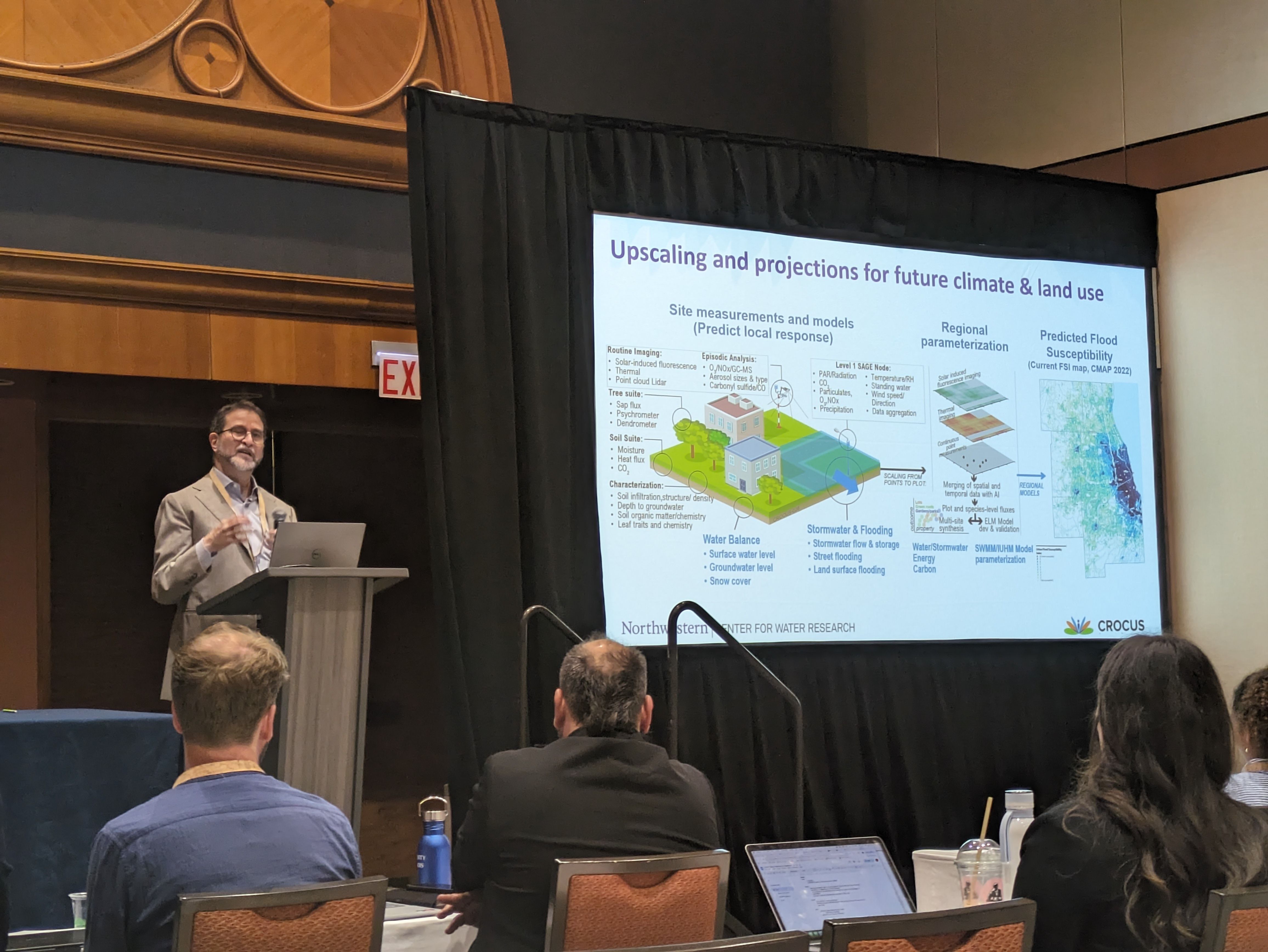 Aaron Packman from Northwestern University presented the work of the CROCUS Urban Integrated Field Laboratory, which investigates different types of urban green spaces on flooding and water movement. CROCUS applies multi-scale observational science to inform solutions to extreme weather challenges.