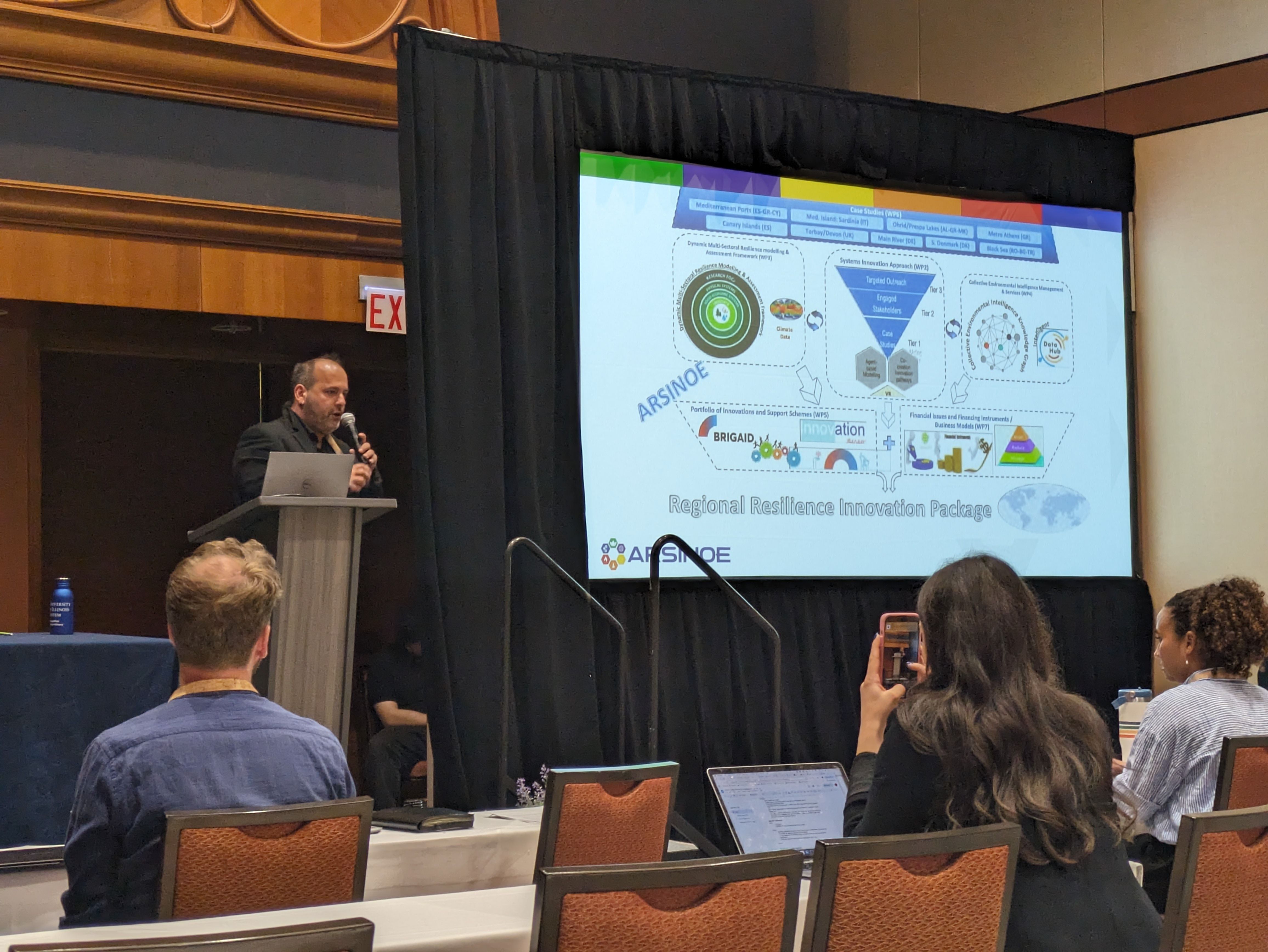 Conrad Landis presented the Hybrid Financial-Sustainability Model, developed within the ARSINOE project, to monitor short-term and long-term Environmental, Social, and Governance (ESG) targets. Conceived by AUEB, the model integrates sustainability and financial metrics to measure certain Key Performance Indicators (KPIs) across critical ESG areas such as water-use, labor conditions, and responsible investment.