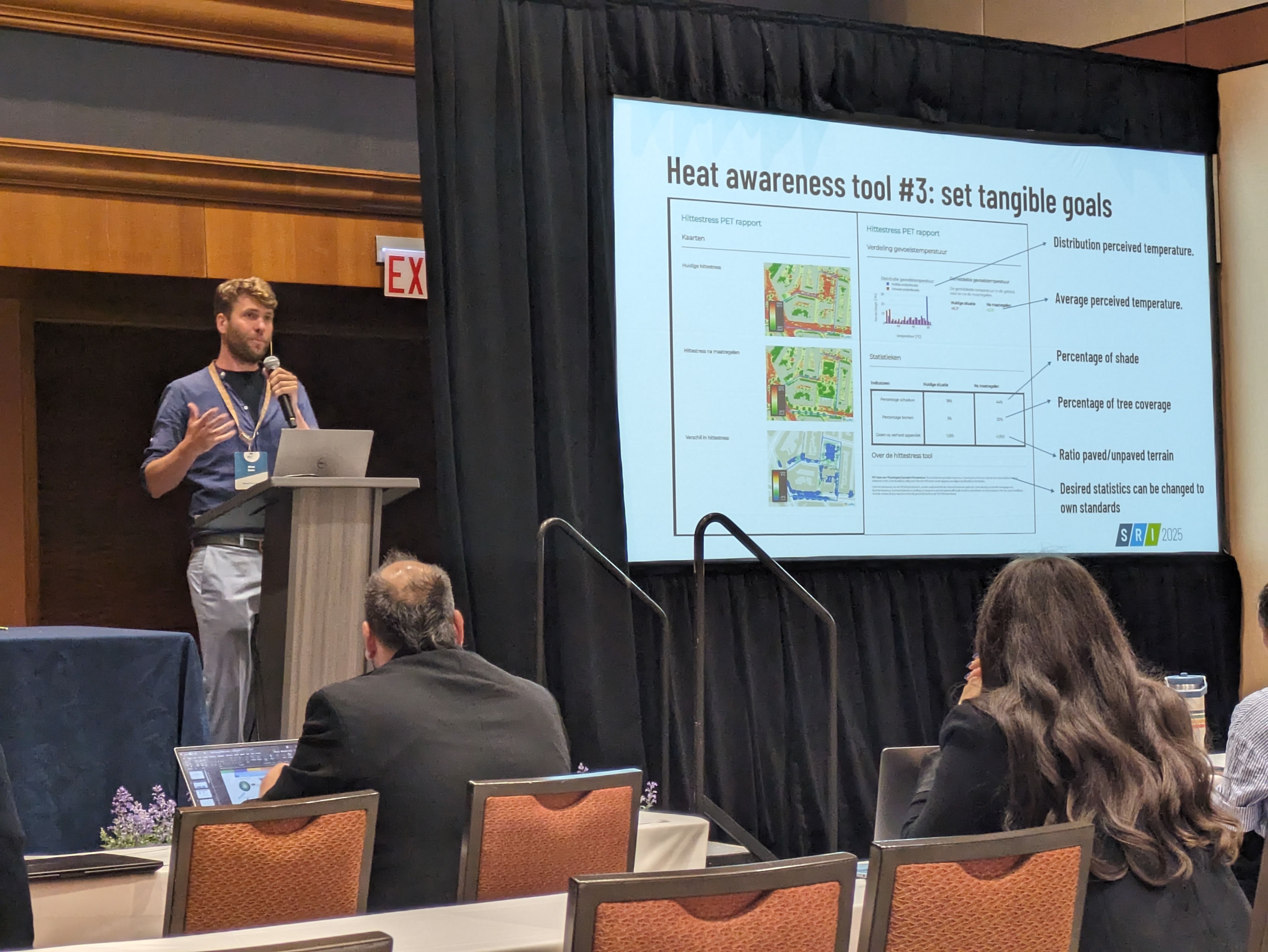 Wisse Beets of Nelen & Schuurmans presented a practical and innovative web-based application, developed within the IMPETUS project, to support the design of heat-proof cities. The tool identifies heat stress hotspots within cities and enables users to design and evaluate adaptation measures in an interactive, game-like interface. This enables municipalities, architects, urban planners, and citizens to explore how different planning choices affect experienced heat stress.