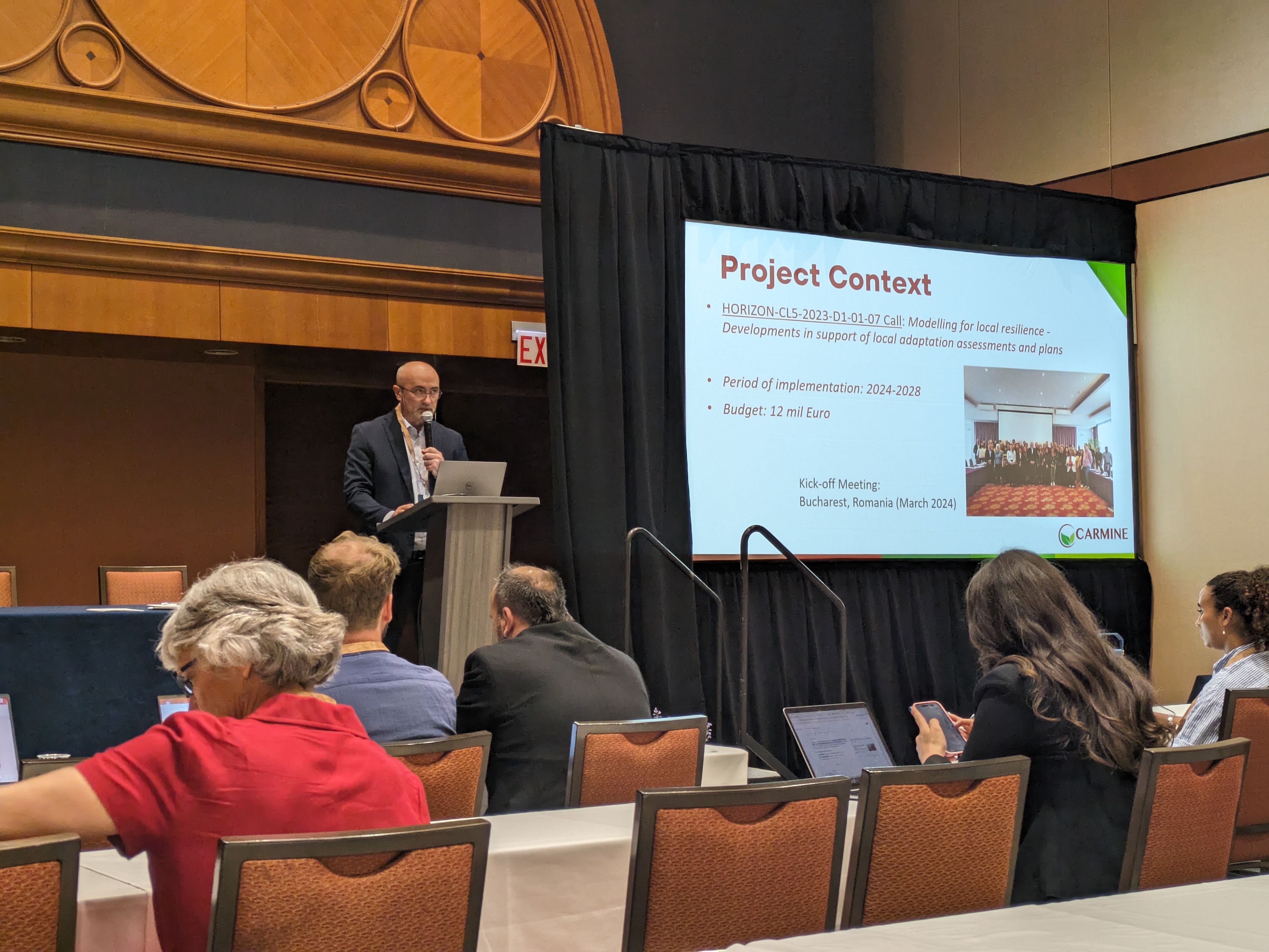 Sorin Cheval presented the CARMINE project, an initiative designed to strengthen climate-resilient development in Europe’s metropolitan regions. Its goal is to support informed decision-making across governance levels by integrating both traditional and nature-based solutions (NbS). With a 2030–2035 implementation horizon and long-term vision to 2050, CARMINE brings together 32 partners from 11 countries, spanning science, policy, communities, and local authorities.