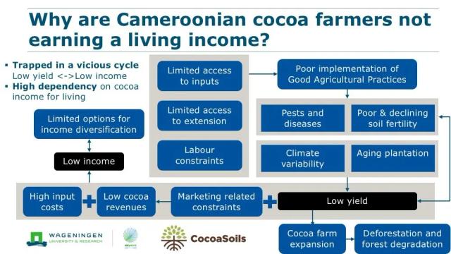 Urcil Kenfack Essougong from Cameroon then showed how a vicious cycle of low yields due to limited access to inputs, climate variability, and other factors, together with marketing constraints, high input costs, and low prices, results in low income for farmers. This low income, in turn, limits opportunities for income diversification and opportunities to invest in cocoa farming. Some solutions are improved access to knowledge and technology through farmer fields schools and cooperatives, the introduction of certification schemes, and bringing back the warehousing system, which Niek Koning and Maja Slingerland discussed in more detail.
