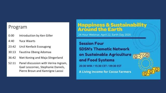 On 22 April, 2020, SDSN Sustainable Agriculture & Food Systems hosted the webinar A Living Income for Cocoa Farmers. This webinar was part of SDSN’s 24-hour webinar celebrating the 50th anniversary of Earth Day by exploring the SDGs through the lens of well-being and happiness.