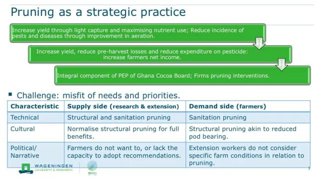 Faustina Obeng Adomaa from Ghana focused her talk on pruning. Pruning can have many positive effects on yields, but the way in which research and extension promote this to farmers forms a technical, cultural, and political mismatch with farmers’ realities. Therefore, she recommends that better feedback mechanisms among research, extension, and farmers are implemented when new technologies and interventions are being developed. She also recommends that new technologies and interventions move beyond fixed protocols to take into account farmers’ diversity.